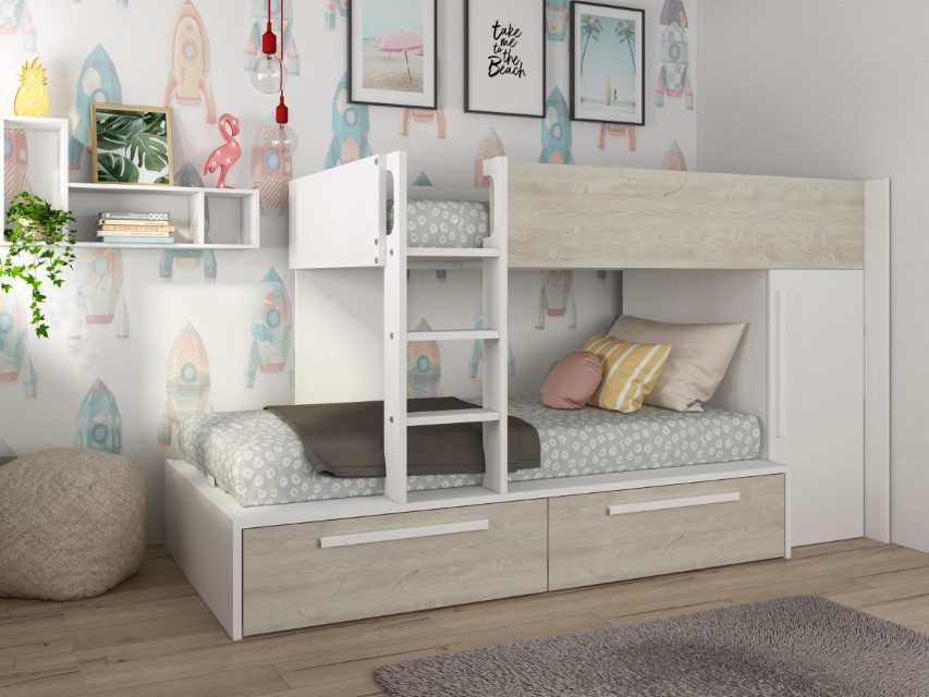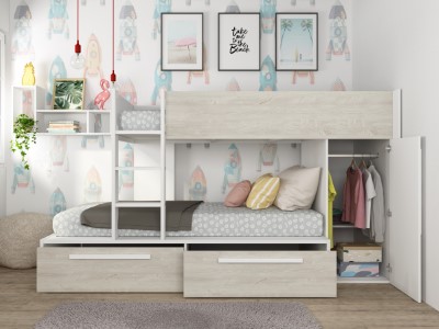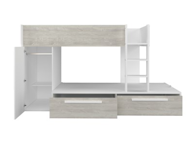 Køyesengen har skuffer for oppbevaring som er på hjul. I enden av sengen er det en liten 2 dørs garderobe med garderobestang. Det er ekstra hyller festet til køyesengen som gir deg rikelig med lagringsplass! Denne sengen er perfekt for tenåringer.
