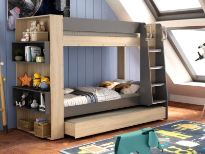 Vakkert designet med uttrekkbare skuffer, vår Onyx Køyeseng er solid utformet for å sikre sikkerheten til barna dine. Med hyller for bøker og bilder, har denne køyesengen enorm praktisk funksjonalitet; kombinert med en tidløs estetikk, er perfekt for barnas soverom.