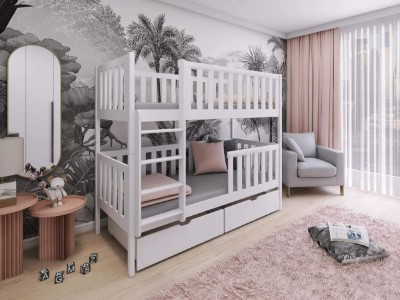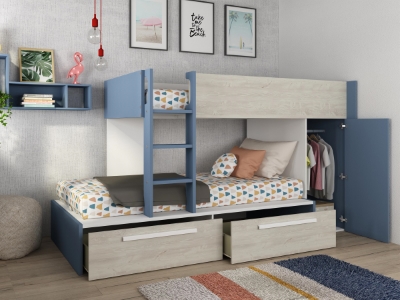 Køyesengen har skuffer for oppbevaring som er på hjul. I enden av sengen er det en liten 2 dørs garderobe med garderobestang. Det er ekstra hyller festet til køyesengen som gir deg rikelig med lagringsplass! Denne sengen er perfekt for tenåringer.
