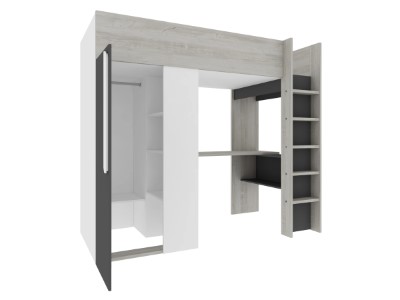 Optimaliser plassen med vår innovative Studio Loftseng, skapt spesielt for kompakte omgivelser. Denne smarte løsningen kombinerer en 1-dørs garderobe utstyrt med flere hyller til siden og en praktisk hengestang, sammen med et stilfullt skriveområde strategisk plassert under sengen.