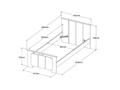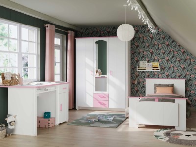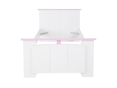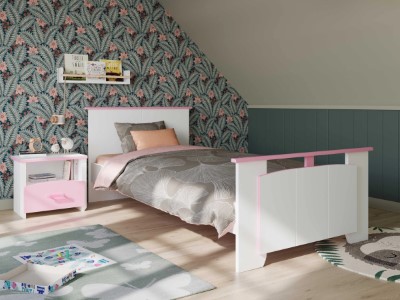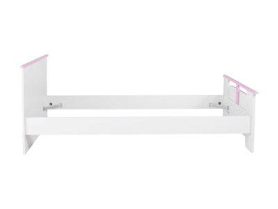 Sengen er utstyrt med vakre, gjennomskinnelige rosa håndtak som gir en unik og personlig stil. Møbelet er laget av sponplater med en tykkelse på 16 og 22 mm, noe som sikrer en solid og holdbar konstruksjon.