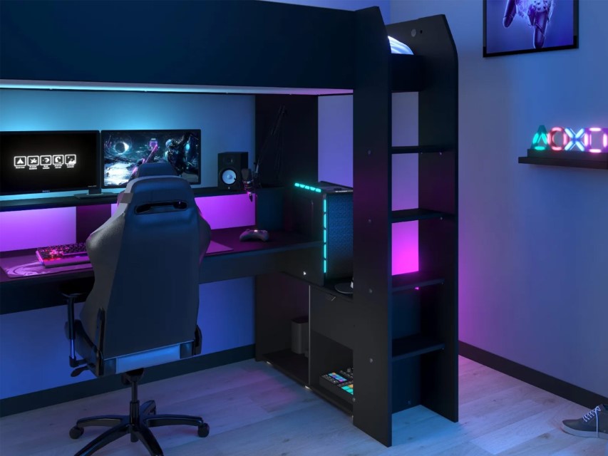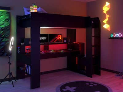 Online Gaming Loftseng fra Parisot tilbyr en seng med spillepult under, som er 184 cm lang, og gir god plass til tastaturer, høyttalere og annet utstyr! Den hevede hyllen med LED-belysning kan inneholde opptil tre skjermer, noe som kan gir stemningsbelysning for å sette scenen.