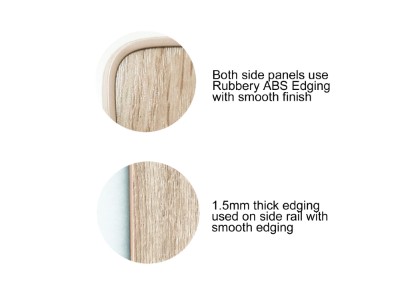 Sengen er laget i laminert MDF med detaljer i gummi og har en flat bunn med trespiler og en midtstøtte i metall. Skuffene gir god oppbevaringsplass, og sidepanelene har gummibelagte kanter for ekstra sikkerhet.