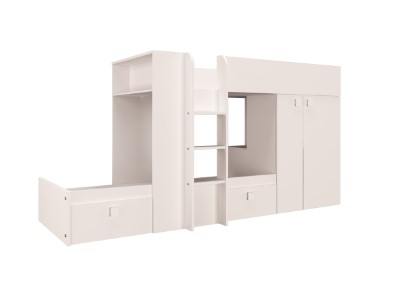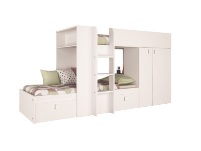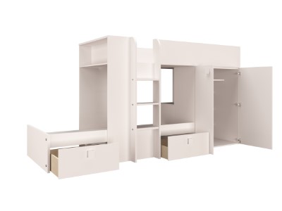 Sengen kommer med en romslig to-dørs garderobe på siden, som strekker seg over hele 85 cm i bredden. Garderoben gir god oppbevaringsplass med både hyller og hengeplass, ideell for to barn som deler rom.