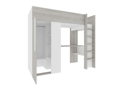 Optimaliser plassen med vår innovative Studio Loftseng, skapt spesielt for kompakte omgivelser. Denne smarte løsningen kombinerer en 2-dørs garderobe utstyrt med flere justerbare hyller og en praktisk hengestang, sammen med et stilfullt skriveområde strategisk plassert under sengen.