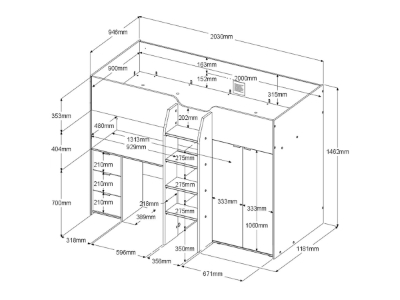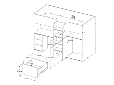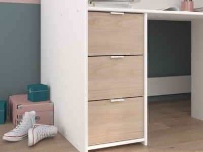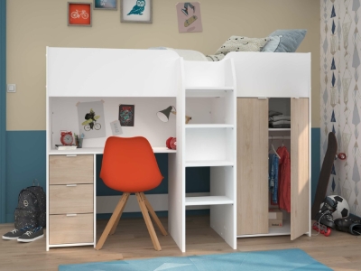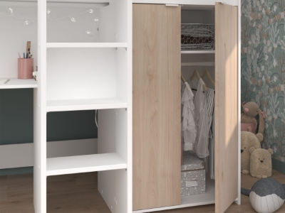 Til venstre for den sentrale stigen finner de et skrivebord med oppbevaringsskuffer - flott for å gjøre lekser, sjekke inn med venner og utforske hobbyene deres! Så til høyre - en romslig dobbel garderobe med klesoppheng og hylle vil holde klærne ryddig.