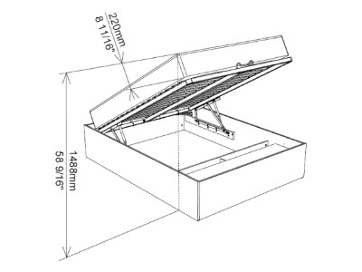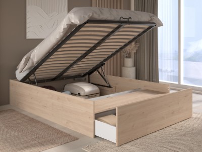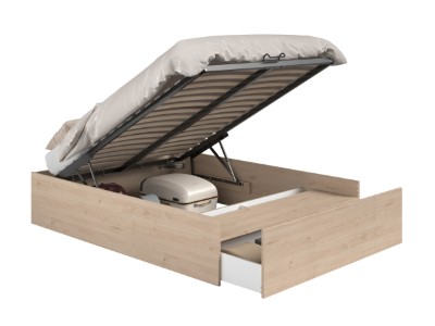 Med innebygde løftemekanismer, kan du enkelt skjule sengetøy, klær eller andre nødvendigheter. Det følger også med en uttrekksskuff på hjul, som gir ekstra oppbevaringsplass og er enkel å trekke ut takket være hjul på undersiden.