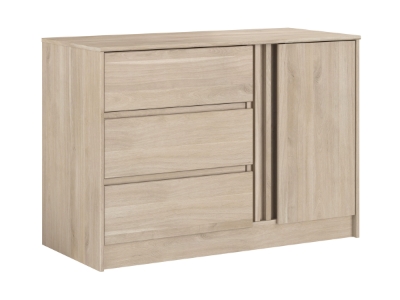 Fullfør oppbevaringsløsningen din med denne elegante Escale kommoden som kombinerer enkelhet og funksjonalitet. Denne enheten inneholder en dør og tre skuffer, ideell for å organisere og oppbevare ulike gjenstander. Under den ene døren finner du to interne avdelinger som tilbyr ekstra plass for å holde ting ryddige og lett tilgjengelige.
